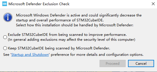 之后会提示信息是否让Windows安全中心扫描STM32CubeIDE,这里可以选择不扫描(第一项),我这里就选择第一项了。