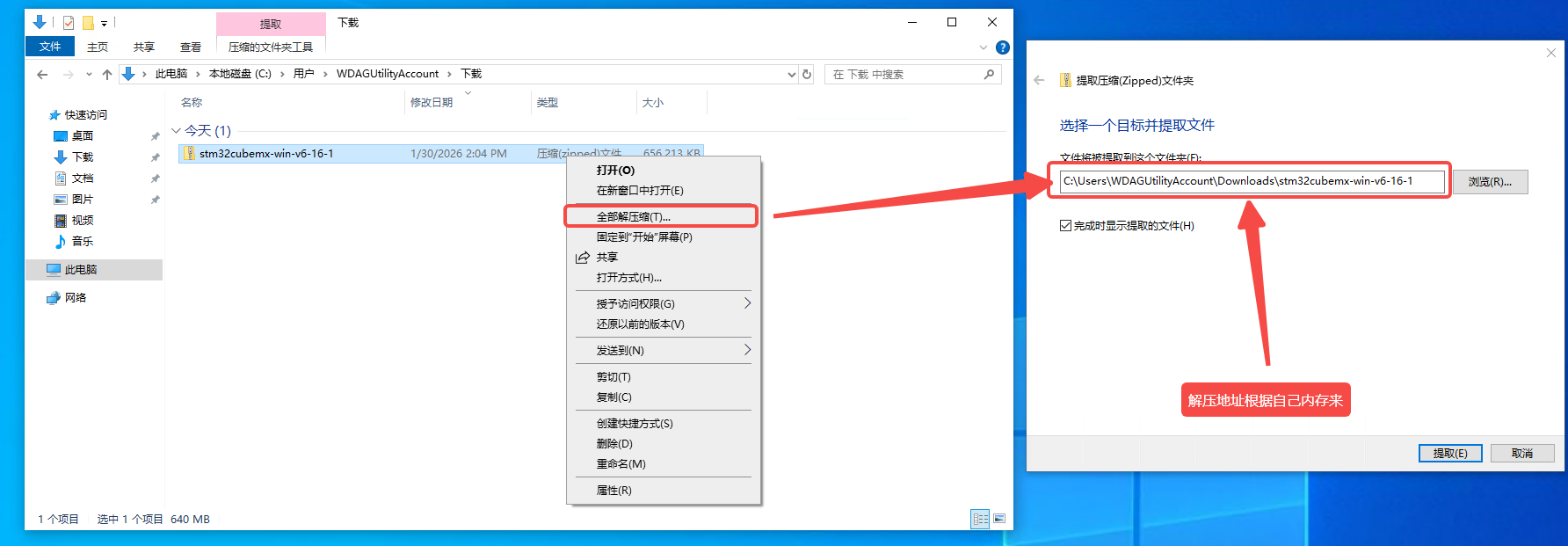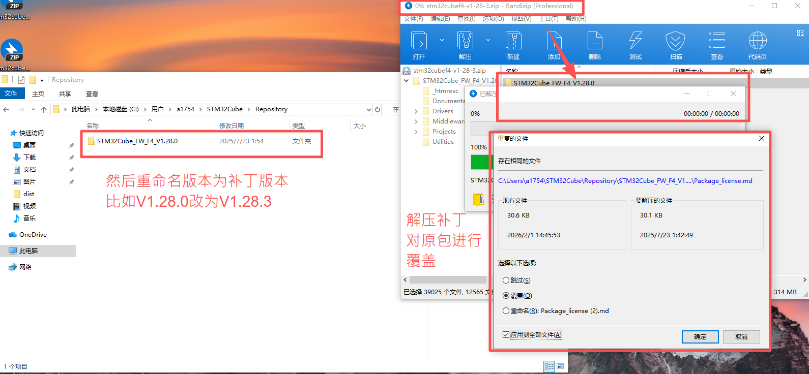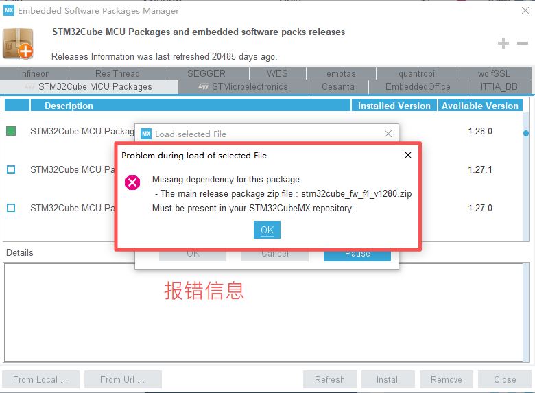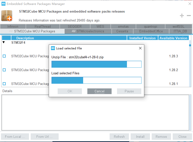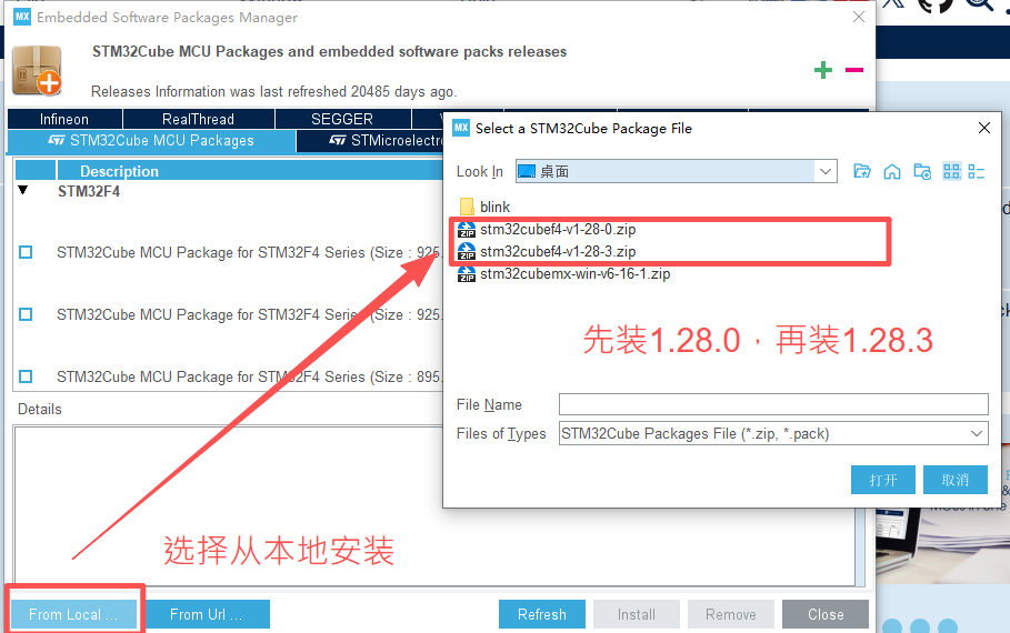 在安装1.28.3的时候出现了无法安装的情况,关闭CubbeMX,显示没stm32cube_fw_f4_v1280.zip,这个时候需要手动安装补丁,打开指定目录:C:\Users\[你的用户]\STM32Cube\Repository下(如果不知道怎么找到这个位置,可以直接使用这个地址%USERPROFILE%\STM32Cube\Repository),然后进行解压覆STM32Cube_FW_F4_V1.28.0,然后改名为STM32Cube_FW_F4_V1.28.3