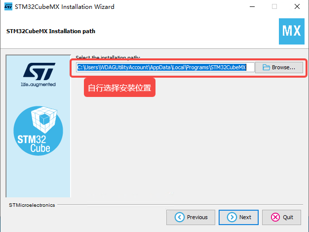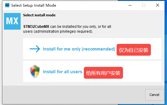 点击后一直下一步,等待安装即可,这里的安装地址根据自己的电脑情况而定。使用Install for me only是安装C:\Users\WDAGUtilityAccount\AppData\Local\Programs\STM32CubeMX中,这个地址对新手而言其实是不太方便的,不推荐。