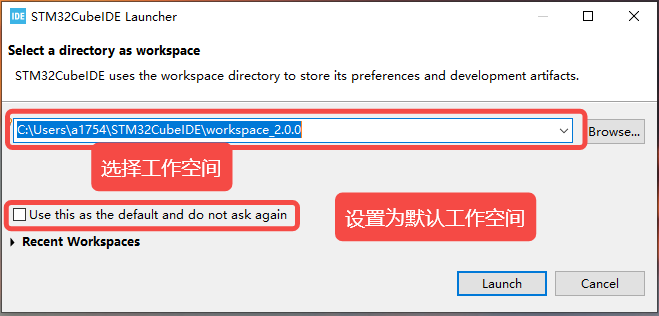 打开STM32CubeIDE后会让选择工作空间(workspace),工作空间就是项目工程保存的默认地址,自行调整地址后可以设置保存为默认地址,之后每次打开就不会弹出选择工作空间了。最后选Launch进入即可。