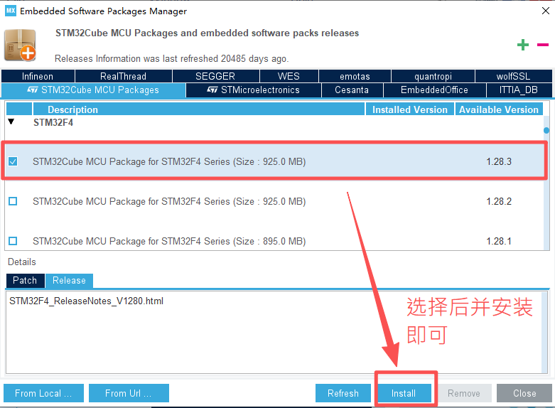 点击安装数据包,直接选择STM32F4(如果你使用的是其他芯片,自行选择即可)。